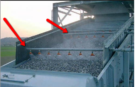 在產生粉塵的入料口、出料口和破碎腔這三個主要部位設置噴水裝置,每處各設置兩個噴水嘴。其中,入料口處兩個噴嘴指向入料口;出料口處兩個噴嘴相對形成一定角度,使噴出的霧水成交叉狀態,達到最佳噴霧效果,振動篩上噴頭裝在頂層篩網上方。